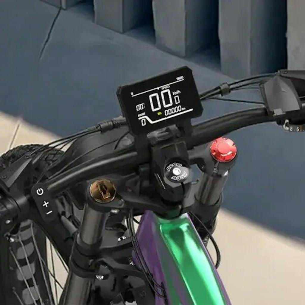 Duotts E26 är inte bara en kraftfull elcykel – den är också en visuell upplevelse. Ramen är tillverkad av hållbar aluminiumlegering, vilket gör cykeln både lätt och stark. Dessutom är ramen täckt av en färgförändrande lack som skiftar mellan blått och grönt beroende på ljusets vinkel. Detta ger cykeln en futuristisk och dynamisk look som får den att sticka ut på vägarna. Designen är både stilfull och funktionell, med varje detalj noggrant genomtänkt för att leverera bästa möjliga körupplevelse.